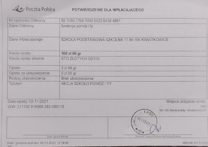 Już tradycyjnie wzorem lat poprzednich nasza szkoła wzięła udział w kolejnej edycji akcji charytatywnej Szkoło Pomóż i Ty. W tym roku szkolnym pomagamy 10- letniemu Kacprowi, u którego zdiagnozowano dziecięce porażenie mózgowe. Aby Kacper mógł prawidłowo rozwijać się niezbędny jest sprzęt, który pomoże mu w komunikacji, nauce pisania, czytania i mówienia. Szkoła otrzymała pakiet startowy pomocy naukowych – cegiełek. Zebraną darowiznę finansową na rzecz Kacpra szkoła przekazała na konto FUNDACJI NA RZECZ OSÓB NIEWIDOMYCH I NIEPEŁNOSPRAWNYCH POMÓŻ I TY. Bardzo gorąco dziękujemy wszystkim, którzy zaangażowali się w powodzenie akcji.
