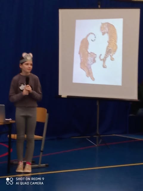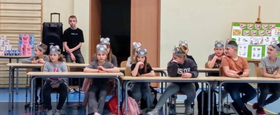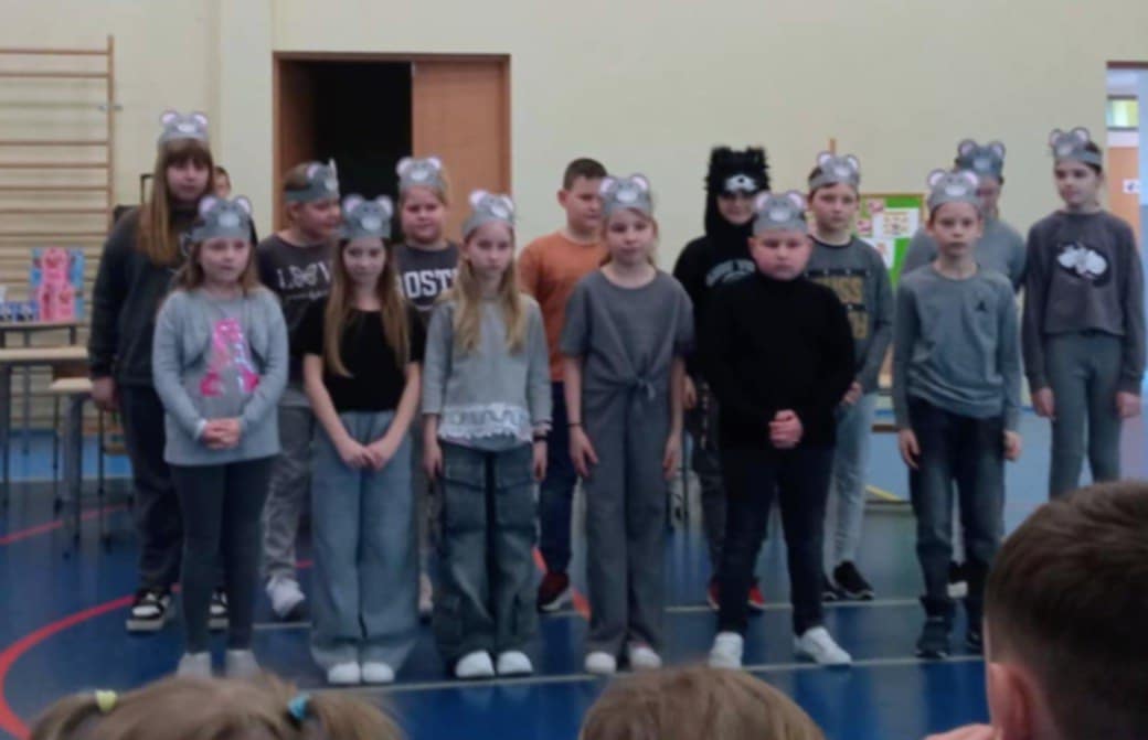 Podczas przedstawienia urocze myszki opowiadały o różnych przedstawicielach rodziny kotowatych. Dowiedzieliśmy się, że koty domowe to tylko mały fragment tej wielkiej kociej rodziny, w której znaleźć można lwy, tygrysy i gepardy –prawdziwe gwiazdy dżungli i sawanny. Na zakończenie widzowie obejrzeli prezentację, w której uczniowie klasy trzeciej i ich wychowawczyni pokazali zdjęcia swoich czworonożnych pupili. Okazało się, że koty mają w sobie coś z gwiazd – niektóre patrzyły dumnie prosto w obiektyw, inne ostentacyjnie ignorowały aparat, a jeszcze inne... najzwyczajniej w świecie spały. Dodatkową atrakcją była gazetka szkolna, na której można było podziwiać zdjęcia kotów różnych ras. Uczniowie z zainteresowaniem oglądali ilustracje i porównywali cechy poszczególnych kotów – od długowłosych maine coonów po eleganckie sfinksy.