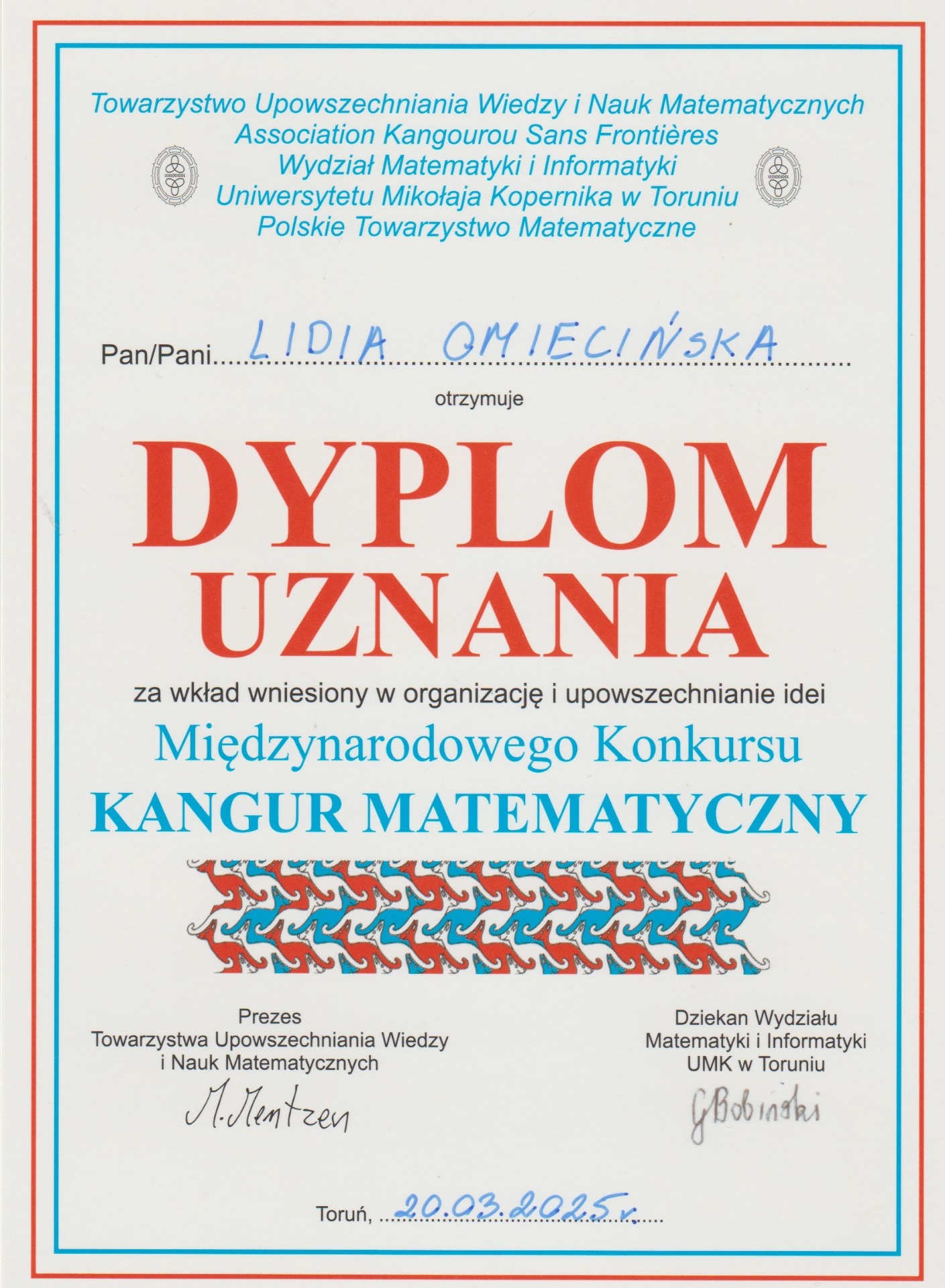 W marcu 2025 roku 31 uczniów naszej szkoły wzięło udział w międzynarodowym Konkursie Kangur Matematyczny, który cieszy się dużą popularnością wśród młodych pasjonatów matematyki. Konkurs ten, odbywający się w kilkudziesięciu krajach, pozwala uczestnikom sprawdzić swoje umiejętności logicznego myślenia i rozwiązywania problemów matematycznych. Uczniowie rywalizowali w różnych kategoriach wiekowych, a ich zaangażowanie i determinacja było widać podczas rozwiązywania testu.. Cieszymy się, że mogliśmy być częścią tego prestiżowego wydarzenia i gratulujemy wszystkim uczestnikom!
